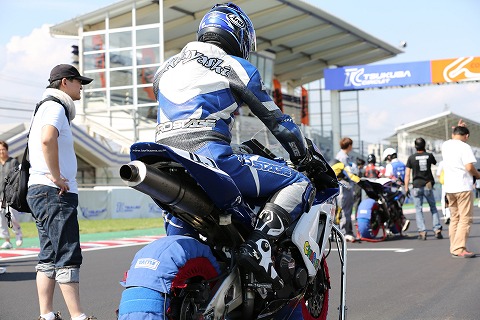 13:28 グリッドに 前のクラスの決勝が終わり、パドックからバイクを押してコースイン。 グリッドにバイクを止めます。 ライディング中にツナギが引っかからないよう、ストレッチ。 でも、端から見ると土俵入り?(笑) |
