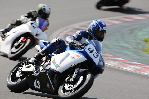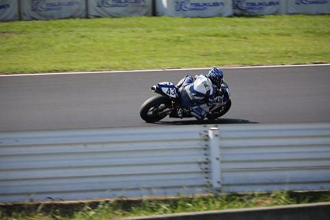 13:35 レーススタート 日章旗が振り下ろされて、レースがスタートしました。 NMクラスは10周で争われます。 ウォームアップランを終えて、スタートでライスポののバイクの後ろに付いたら、写真に写るかなぁ〜。なんてふと考えてたら、レースがスタートしちゃった。(汗) スタート前にアクセルをレーシングするのも忘れて、半テンポ遅れてのスタート。 他のライダーが伏せているのに、自分だけ頭一つ高い。 ( ̄。 ̄;) |