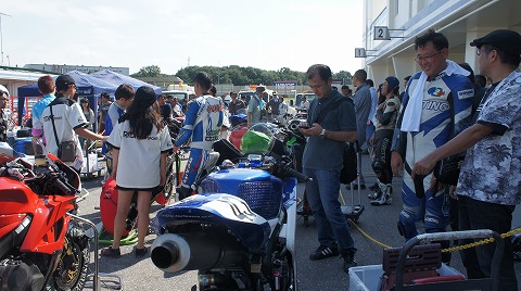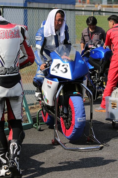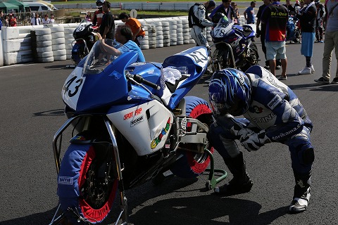 13:04 ウォーミングアップエリアで 13時を過ぎてライディングの準備をして、ウォーミングアップエリアまでやってきました。 決勝前、一度エンジンに火を入れて暖めておきます。 今日は天気も良く、それほど暑くもなく過ごしやすい気温です。 けれども、ツナギを着て気合いが入りアドレナリンが分泌されると、暑くて汗が出てきます。 暖機を終えても、パドックのスタート前チェックが始まるまで、ここで待機することにします。 |