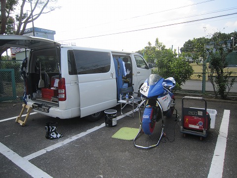 12:53 待機中 10時前に予選が終わりハイエースが置いてある駐車スペースに戻って来ました。 10時40分からはライダースブリーフィング。 昼食は食べると胃袋に血液がいって眠くなるので、レースの後で食べることにします。 それまではここで待機します。 レースのスタート前チェックは13時20分からなので、13時を過ぎたらツナギを着てライディングの準備をしてパドックに向かういます。 |