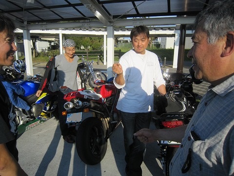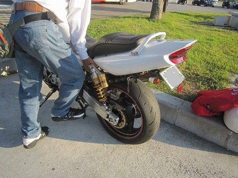 16:30 トラブル ジュージャン→水分補給も終わって、帰ろうとすると、トラブル発生! やっしーのXJRのリヤタイヤがパンク! (汗) 完全に空気抜けちゃってます。(ToT) 帰りのレポは簡単になりそうだったけど、ネタが出来ちゃったね。(笑) |