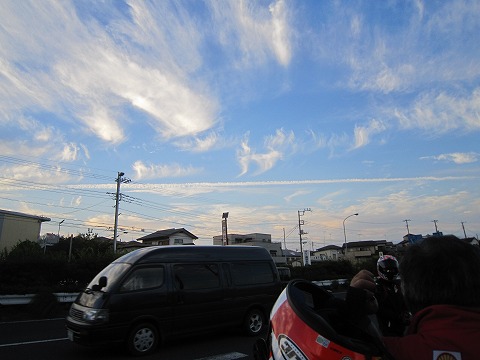 17:12 ちょっと待って 土浦北インターで常磐道を下り、国道125号線を東進。 国道6号線との立体交差で右折して、国道6号線へ。 パンクしたヨッシーが来てません。 ここで、ちょっと待ちます。 そして、待っている時間にやっぱり空を見上げてしまう。 「真っ直ぐに延びているのは、”地震雲”か?」 しばらく空を眺めていると、やっしーがやってきました。 パンクしたので、高速で飛ばすのを控えていたとの。 大丈夫です。 法定速度内なら飛ばしても。 |
