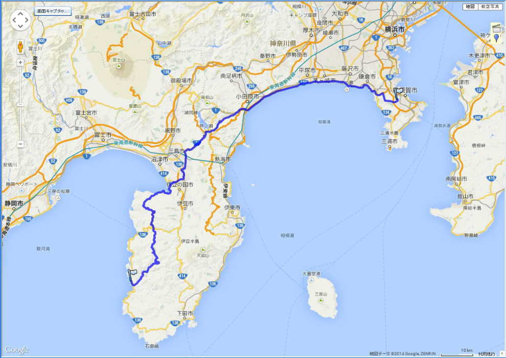 10:07 西伊豆に下りる 今日の目的地は、西伊豆の堂ヶ島にある加山雄三ミュージアムの近くにあると言うお店。 西天城高原牧場の家から西伊豆に下りる最短ルートは、県道410号仁科峠宇久須線ですが、先週の台風の影響か、通行止めでした。 やむを得ず、距離は長くなりますが、同じように走る県道59号伊東西伊豆線で西伊豆の海岸端に下りることにします。 |