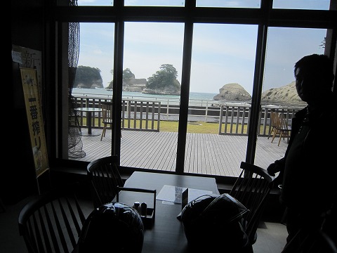 11:01 お好きな席は 『お好きな席にどうぞ!』 と言うことで、窓際の堂ヶ島の断崖が一望できる席を確保。 外の席もあるけど、今日は風が強く、時折波しぶきが飛んでくるので、お薦めじゃありませんね。 |