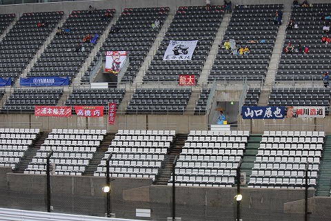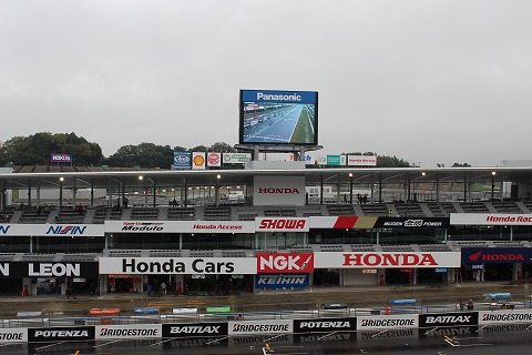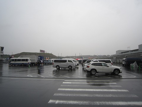 9:19 グラントスタンド側 グランドスタンド側にやってきた。 2010年から(全日本)のヘルパーをしていたので、こっち側(観客側)にくる機会がありませんでした。 グランドスタンドは、前の方は屋根が無いけど、真ん中から後ろは屋根があるので、濡れずに観戦できます。 大型モニターもあるので、予選はここで観戦することにします。 |