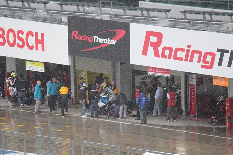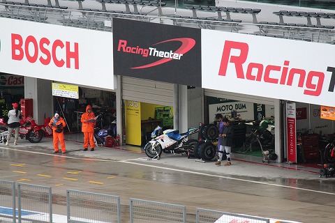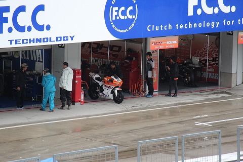 8:28 パドックに GPスクエアーでH2Rを見た後、ホームストレート下の地下トンネルをくぐってパドックにやってきました。 普段のレースウィークであれば、もっと人がウロウロしてるんですが、雨のおかげで、人影もまばら。 |