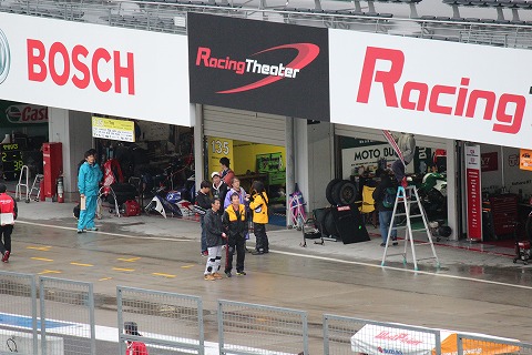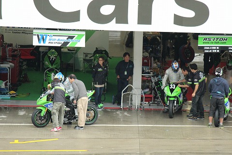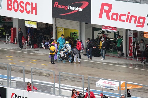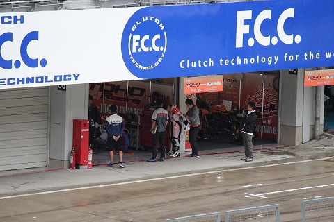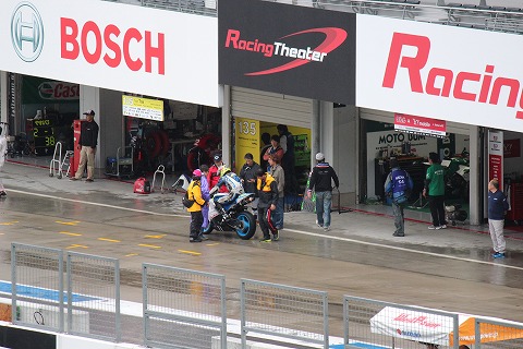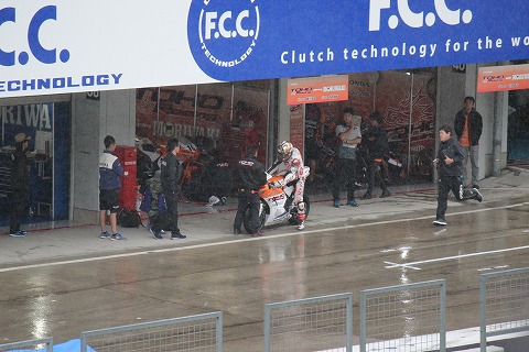 9:22 レンズを向けると そして、レンズを右側にパーンすると、TOHO RACING のピット前では、走行の準備のためレイン ウェアーを着込む國川選手の姿が・・・・。 じゃなかった。 國川選手はレインウェアーを着ずに予選を走ったそうです。 なので、レインウェアーを着ているのは、チームメイトの宮嶋選手でしたね。 |