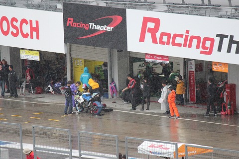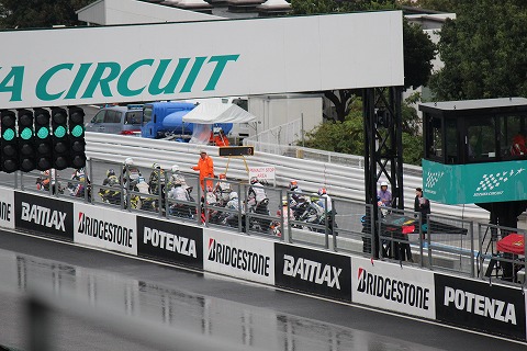 9:30 予選開始 9時30分、ピットロードエンドのシグナルがグリーンに変わり、定刻にST600の予選が開始になりました。 各バイクがコースに流れ込んで行きます。 コンディションは雨が降り続くウェットです。 |