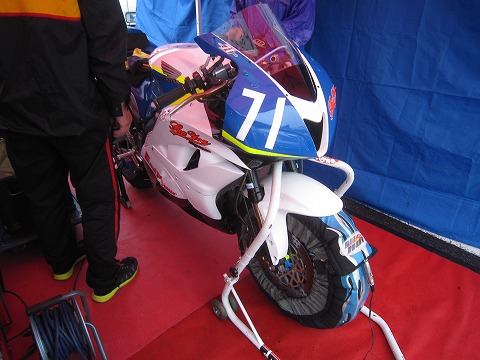 8:45 マシンは マシンはもちろんHONDAのCBR600RR。 タイヤはDUNLOP、ゼッケンは#71。 ST600の予選は9時30分から、お邪魔をしてはいけないので、挨拶も早々に観客席に移動することにします。 |