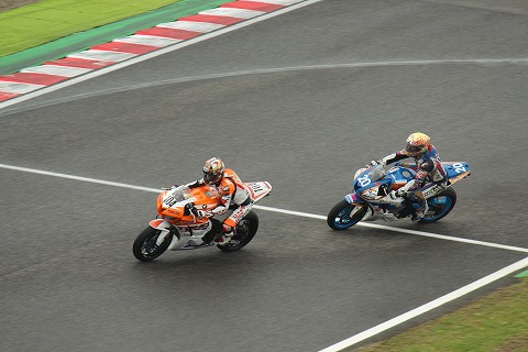 10:25 ドッペルゲンガー? 3周回目か4周回目、14番手争い。 前を走っていた#104の國川選手に追いついたチームメイトの#16宮嶋選手。 シケイン2つ目、しっかりとアウトに並びかけ、まるでドッペルゲンガー状態。 このレースに関して言えば、ホイールの色が違ってるんだね。 前を走っているのは#65 タイのチャランポン・ポラマイ選手。 前戦までのランキングは2位、1位の小林龍太選手とは7ポイント差。 チャンピオン獲得には少なくとも小林龍太選手と5番手以上前でゴールする必要があります。 #24の小林龍太選手は2つ前の10番手辺りを走行中です。 |