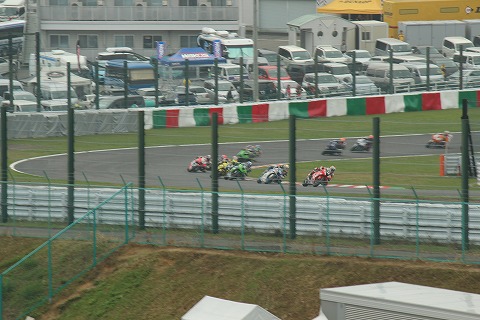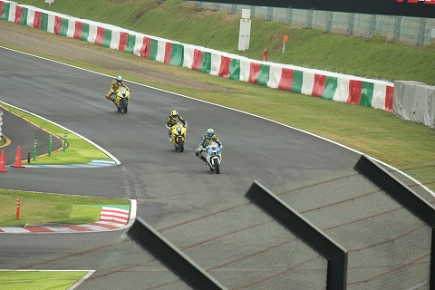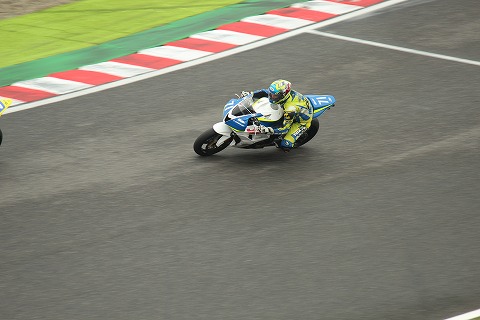 10:05 サイティングラップ ST600クラスのスタート進行が始まり、各バイクがコースイン。 鈴鹿のコースを1周、サイティングラップを行って、各グリッドに付きます。 自分は引き続き、最終コーナーのスタンドでレースを観戦します。 そして、最終コーナーにやってきたのは、國川選手・・・・。 ではなくて、チームメイトの宮嶋選手。 見分けるのが難しいっす。 (^_^;) マシンのカラーリング、レザースーツも遠目から見るとほぼ同じ。 ゼッケンは望遠で撮ると読めるけど、肉眼だとムリ。 違いはヘルメットの色だけかなぁ。 |