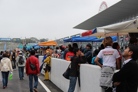 13:16 ピットウォール側にも ピット側は、RQさんとライダーさんにお客さんが群がっていますが、普段は人が集まらないピットウォール側にも人だかりが・・・・。 |