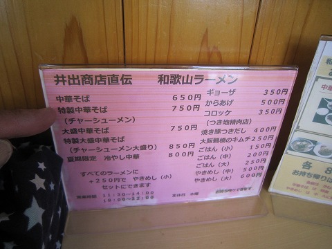 11:40 井出商店直伝 店内はラーメン店らしく、カウンターとテーブル席。 カウンター席に座り、メニューを見ると、”井出商店直伝”と書いてある。 ラーメンとか詳しくないんでよく分かりませんが、井出商店って和歌山ラーメンの老舗みたいですね。 そして、注文は”特製中華そば”(\750) お昼前ですが、近所の人で七割がた席は埋まっていて、繁盛店の様です。 |