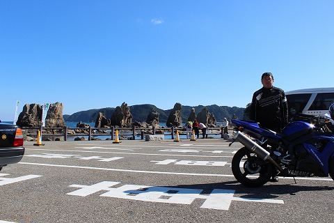12:59 橋杭岩 国道42号線を南下し、潮岬の近くまでくると、左手に海の上に連続して並ぶ奇石群が見えてきます。 橋杭岩(はしぐいいわ)です。 能書きは色々ありますが、その辺はwikiにまかせて。 観るのは今回で2回目ですが、バイクを駐めて写真を撮る価値がある景色ですね。 と言うことで、自分も入って写真をパシャリ! |
