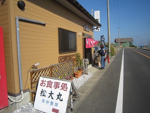 12:02 ツーリングのお昼は 千葉県内ツーリング、今日の昼食は、南房総市千倉町までやってきました。 お店の名前は、”松大丸(しょうだいまる)” 外房に沿ってを走る国道410号線のさらに海側に走る海沿いにある食事処です。 ”松大丸”の名前が示すとおり、釣り船もやっています。 釣りが趣味のアイスエイジさんがお知り合いのお店です。 さっそく、店の脇にある駐車場にバイクを駐めて、入店します。 |