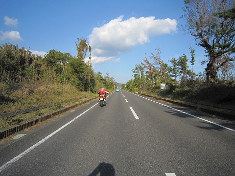 13:50 一直線に伸びる 南房千倉大橋公園でジュージャンをしたあと、一旦国道410号線に入り北上、その後県道297号和田丸山線に入りました。 県道297号線は、海岸線から一歩入った所を走る県道で、砂防の意味からか木があって海岸線は見えず、一直線に伸びる道は少々退屈。 なので、写真を撮ってみる。 |