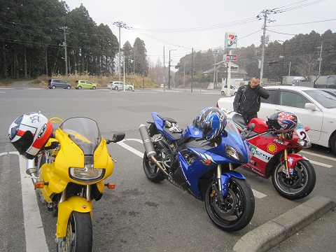 10:10 しばらく待って岩井さん登場。 岩井さんはこの近くだからね。 予定より早く出発したのを電話で連絡して、飛んで来てもらった。 今年の元旦ツーリングは以上3名です。 バイクは久しぶりに、赤黄青の3台がそろいました。 (^_^)v それでは、出発します。 |