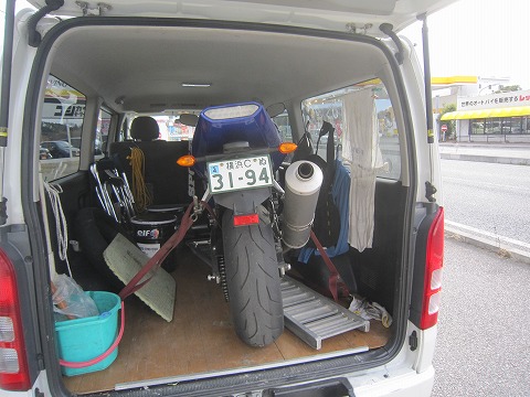 9:13 K2Yに到着 朝7時に自宅を出発してK2Yに到着しました。 出発の予定時間が10時なので、かなり早い到着になっちゃったね。 当然、だれも来ている人は無し。 まあ、ぼちぼちハイエースからR1を降ろして、ツーリングの準備でもしましょうか。 |