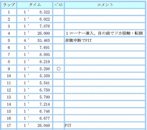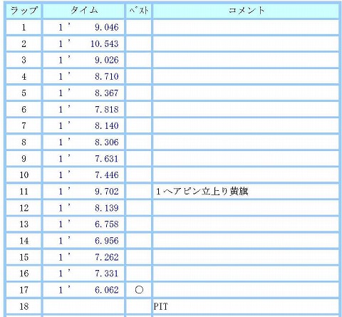 9:40〜10:00 B2 前置きが長くなっちゃったけど、9時40分の定時にB2クラスの走行が始まりました。 4ヶ月ぶりの今シーズン初の走行なので、まずは慣熟走行から。 土曜日ということもあって、走行台数はフルで、相変わらず多いですね。 調子がイイと前を走るバイクが邪魔だたりしますが、今日は目の前のバイクはいいペースメーカー。 とりあえず、前の集団について行くことにしまーす! 半分ほど走って、タイムは7〜8秒台。 遅いことは遅いけど、余裕があるのでペースアップします。 11周目、1コーナーの立ち上がりで転倒バイクあって黄旗。 ここで、ペースを落として、前とのスペースを開けます。 1コーナーの黄旗がクリアーになって、ペースを上げて13周目6秒台に入りましたね。 そして、最後17周目に1本目のベスト6秒0で終了。 1本目、かなり余裕をみて走って6秒だったので、自分的にはシーズンはじめとしては、調子は良いみたい。 走っているのも、まだ余裕があるので、もう少し行けますね。 |