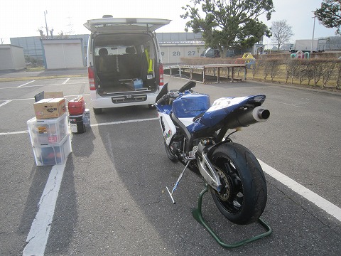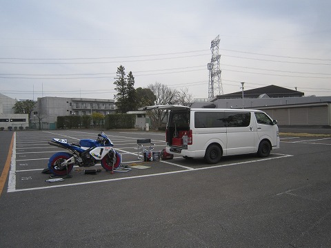 7:33 走行準備 ハイエースを駐めたら、さっそく走行の準備。 今日は暖かいんで、2時間前には必要ないけれど、1時間半前にはタイヤウォーマーを巻きたいところです。 でも、その前にタイヤを交換しないと・・・。 本当なら、走行前にバタバタするんじゃなくて、事前に準備して来なくちゃダメなんだけど、年度末と言うこともあって仕事が結構忙しくて・・・・。 この練習走行もやっと時間が空けられたんです。 と、言い訳しておく。 |