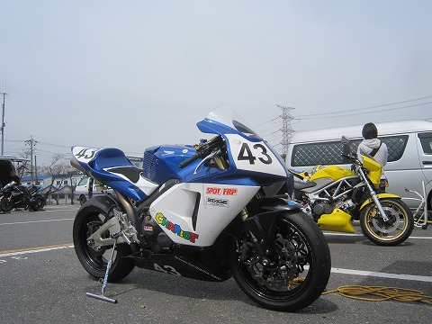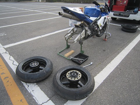 8:21 フロント側 スプロケットの交換が終わったら、チェーンの調整をした後、リヤにはタイヤウォーマーを巻いて暖めておきます。 そして、次にフロントタイヤを交換。 フロントも交換が終わったら、タイヤウォーマーを巻いておきます。 1本目の走行が9時40分からなので、1時間半にはちょっと足らなかったけど、「今日は寒くはないし、1時間以上はウォーマーがかけられたから”大丈夫”」と言うことにしておこう。 まあ10分20分の差は、気持ちの問題です。(笑) |