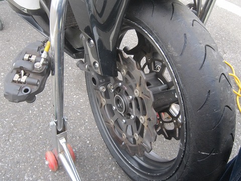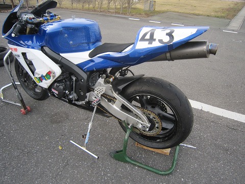 7:40 リヤタイヤを交換 今履いているタイヤは、2月に四日市に出張に行ったとき、「もしかして鈴鹿で走れるかも」と思って、去年の筑波TTでだけ使ったほとんど減ってないタイヤを装着してるんだよね。 (鈴鹿で走行すると筑波に比べて結構タイヤ減ります。) なので、今履いているほとんど減ってないタイヤは外してキープしておいて、そこそこ減っているタイヤで走行しようと言う訳です。 タイヤ交換は、まずはリヤから。 |