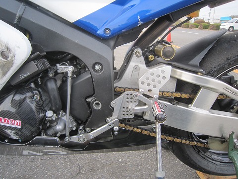 7:50 ファイナルを ファイナルの設定が去年の12月に鈴鹿を走った時のまま。 ドライブ側のスプロケットは鈴鹿仕様の16丁が付いてます。 これを筑波使用に変更しないと。 スプロケットを交換するのに、まずはシフトのリンケージが邪魔になるので、リンクの上側で外しておきます。 |