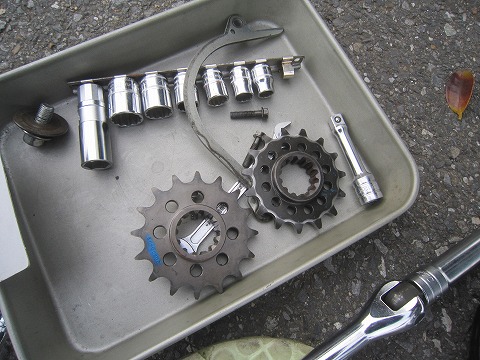7:51 ドライブ側のスプロケット パカッとカバーを外して、ドライブ側のスプロケットを外します。 CBRのスプロケットはスプリング・ワッシャーとかが入ってないから、楽でイイですね。 |