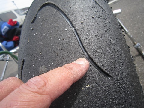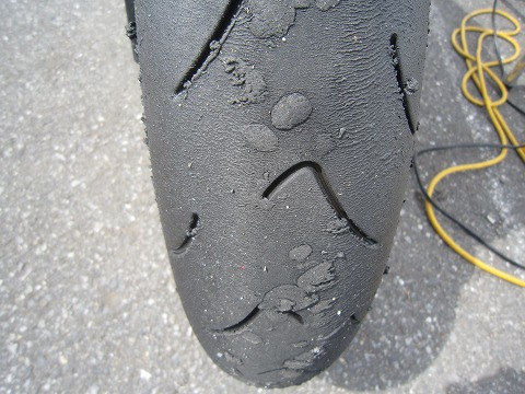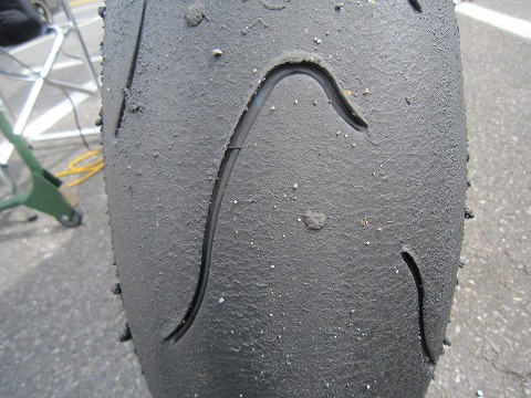 11:59 走行後のタイヤ このタイヤは去年の6月の筑波ツーリスト・トロフィで下ろして、筑波TTは予選レインの決勝のみ使って筑波10周。 その後、7月に筑波練習25分×2本(23周×2本)。 同じく9月に筑波練習25分×2本(23周×2本)。 11月に同じく筑波練習25分×2本(36周)。 使ったタイヤか。 9月のツーリスト・トロフィで下ろして、その後12月の鈴鹿で使ったタイヤか。 分からなくなってしまいました。( ̄。 ̄;) リヤはスリップマークが見えてきて5分山無いですね。 いずれにしても、あと30分2本くらいは走れそう。 あと、細かく見るとリヤの左側のエッジ部分が少し残ってる。 筑波は左コーナーでべったり寝かせるのが、1ヘアピンとAsiaコーナーの2つ目くらい。 1ヘアピンはかなりバンクが付いているので、タイヤの端まで使うと、かなりのバンク角になっちゃいます。 自分としては結構寝かせているつもりなんですけどね。 タイヤ的にはまだ余裕がありますね。 |