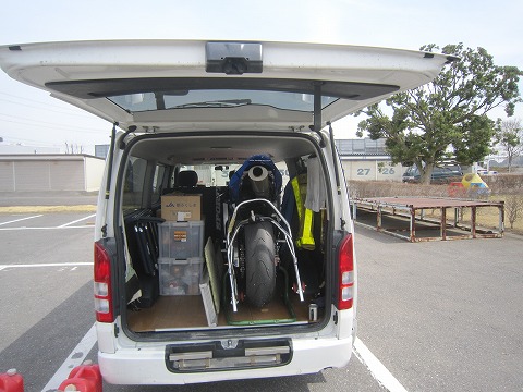 12:38 積み込み 走行が終わったら、エアー圧を確認して、ガソリンの残量を確認。 P-LAPのタイムを記録したら、後片付け。 バイクと荷物の積み込み。 お昼を過ぎて、お腹が空きました。 早く片付けて、昼ご飯を食べに行こう! |