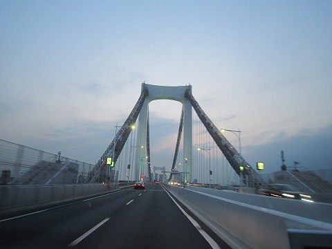 18:50 レインボーブリッジ 自宅のある横須賀を出発して、国道16号線を北上。 幸浦インターから首都高湾岸線に上がり、レインボーブリッジまでやってきました。 自宅からここまで、1時間ちょい。 夕方の通勤時間帯と重なったこともあり、国道16号は所々ペースが遅く、いつもより少々時間がかかったかな。 この先、首都高環状線から一度下に下り、用件を済ませて、郡山に向かうことにします。 |