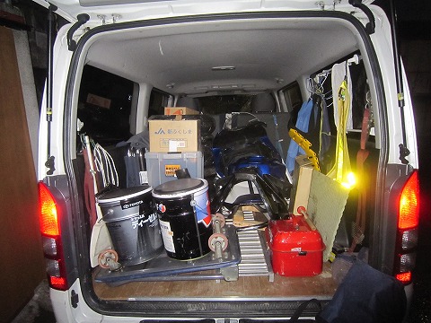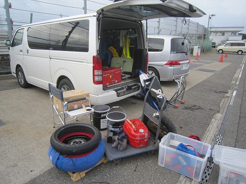 4:02 バイクは? 昨日まで茨城県の日立市で仕事をしていました。 昨晩、仕事から帰って仕事用の荷物を下ろし、レースの荷物を積み込み。 窓際にかけられた”トラチョッキ”(工事現場のおっさんが着ている反射板付きのチョッキ)が土方クルマの雰囲気を醸し出しています。(笑) 『あれ? メインのCBRが無いじゃん!』 CBRはミッションの調子が悪くなり、エビスサーキット走行会の次の日S-GRIDの清水さんに修理を依頼。 今週末の筑波TTで併催されるピレリカップに國川くんが出場するので、一緒に筑波サーキットまで運んでもらうことにしてあります。 と言うことで、バイクが無いので、何となくしまりませんね。 雨が降ったら困るので、荷物になるけど、テントを持って行くことにしよう。 |