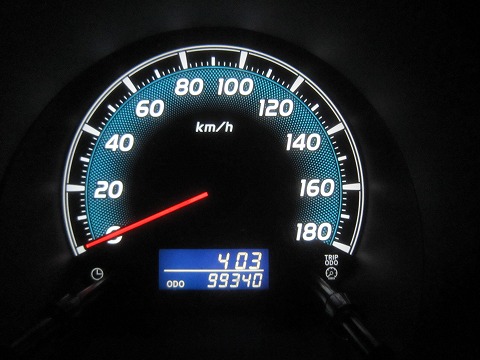4:03 出発 なんとなく、いつもあるところにあるものがないと、忘れ物をしたような感じですが、荷物チェックをして出発することにします。 走り初めの距離計は 99,340 km と10万キロ間近! (^_^;) |