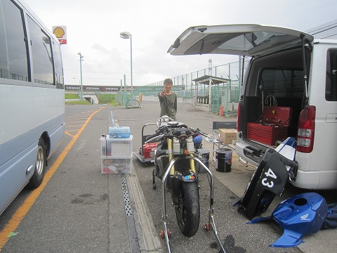 7:00 飯野さんも マイクロバスからCBRを降ろしたら、走行の準備です。 明日の筑波TTを走るのと、明後日のピレリカップに出場する國川くんのヘルパーで、飯野さんも登場! CBRは積み込みの邪魔になるので、カウルは全部取り外しておきました。 これから、カウルを付けて、タイヤを付け替えます。 走行まで、あと1時間。 あまり時間の余裕がありません。 急ぎます! |
