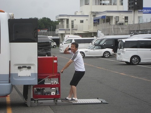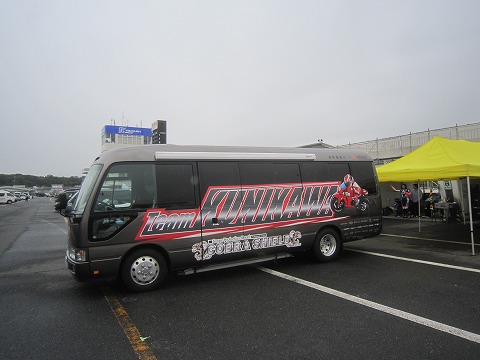9:06 Team KUNIKAWA 走行の準備も一段落。 ピット側の駐車場には國川くんのトランポ TeamKUNIKAWAのマイクロバス。 「派手ですねぇ〜。」 これなら、全日本のパドックに駐まっていても、目立つこと間違いなし。 悪いことは出来ませんぞ。(笑) 國川くんも明後日のピレリカップのため、今日のスポーツ走行を走りにきました。 自分とはペースが違い過ぎるので走行枠は別ですが・・・残念!? |