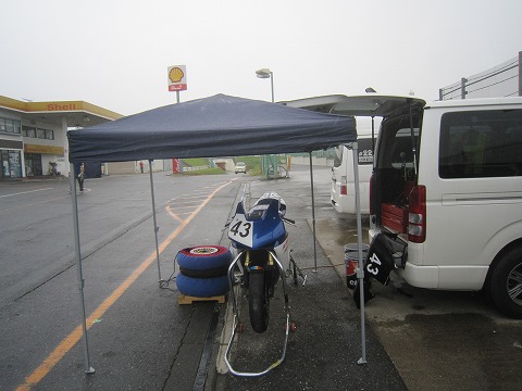 7:52 雨が 8時の走行に向けて、準備をしていると 『雨がぁ〜!』 『降ってきました。 (T_T)』 あっという間に、路面はウェット。 『ダメじゃん。』 とりあえず、持ってきたテントを広げます。 (持ってきたテントが早速役にたちました。) |