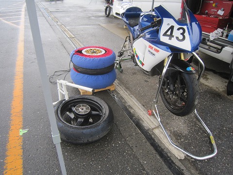 7:52 タイヤ交換 1本目の8時からの走行は、ウエットコンディションになってしまったので、走行はなし。 今までCBRに付いていたホイールから終わったタイヤを取り外して、雨でも走れる様、レインタイヤに交換しておきます。 明日の天気予報を見ると晴れ、降水確率は10%以下。 レースはドライコンディションで走れるでしょう。 なので、今日無理してレインコンディションの中走る必要もないんだけどね。 なんて、先のことを考えて走らない選択をするのは、守りに入っていることだよね。 勢いのあるときは、明日のレースのことなんか関係無く、雨が降っていようが走るのが楽しい。なんてモチベーションが本当は大事なんだろうけど。 と話しが逸れたが、 修理してもらったミッションの確認と軽く慣らしだけはしておきたいので、今日予約してある4本の走行が全部雨でも1本くらいは走らないとね。 |