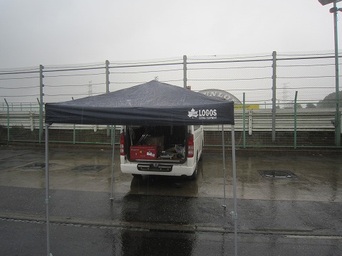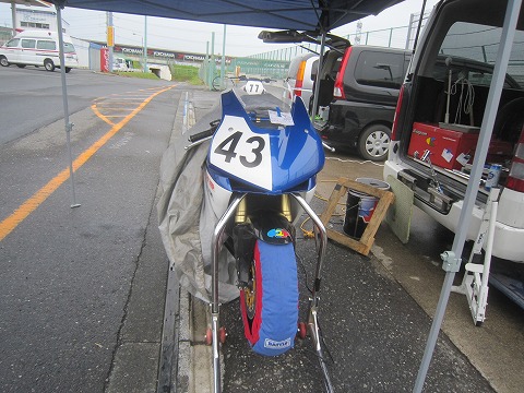 13:54 ジャジャ降り 午後になって雨はジャジャ降り。 風も出てきて、テントでは足りずバイクが濡れないようにバイクカバーをして雨をしのぎます。 逆に、ジャジャ降りの方が、タイヤの選択で迷わなくて良いし、気が楽っちゃ楽。 特スポ2本目の走行は 14:00〜14:20です。 レインタイヤ履いて走行準備をしておきます。 |