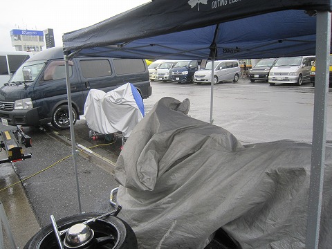 15:07 機材を移動 雨の中、テントの下でタイヤ交換なんて嫌だなぁ〜。 なんて、周囲を見渡すと、早い連中はもう引き上げ始めて、ピットが空き始めたので、バイクと機材を移動しちゃいました。 |