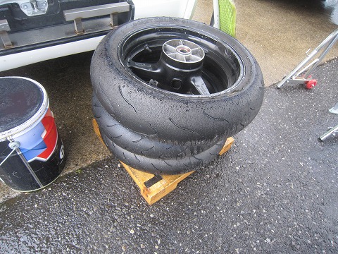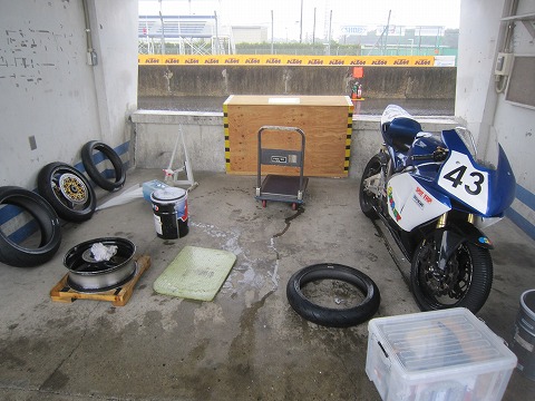 14:49 タイヤの組み付け 今日のすべての走行が終わったところで、明日のレースに向けて準備をします。 まずは、タイヤを新品に交換しないと。 なんですが、風が横から吹き付けるので、テントの下でも雨が入ってきてしまいます。 この状態でタイヤを組み付けると、タイヤの中に雨の水滴が入っちゃいますね。 タイヤの内側に水分が入ると、エアー圧の管理が難しくなるそうで。 昔(1980年代くらい?)はタイヤを組み付けるときに、ビートに石けん水を付けて組んでたでしょ。 あれが、タイヤが冷えてるときと、暖まった時のエアー圧の管理が難しくなるらしいこともあって、今はタイヤを組み付けるときは、ビートクリームを使うようになったとか。 自分で、水分を付けてタイヤ組んで、確認した訳じゃないんで確かかどうかはわかりませんが、言われればそんな感じもします。 なので、この状況ではタイヤ組み付けたくないなぁ〜。 |