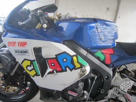 17:02 ステーカーを貼り直し 明日の準備が終わったら、最後にステッカーの貼り付け。 前にまるえさんにもらった”CHARIOT”のステッカーですが、左サイドは転倒して中途半端に剥がれてました。 今年の初めに新しいステッカーをもらったので、明日のレースに向けて貼付け。 今回もらったステッカーが予想以上に大きくて、アッパーカウルに収まりきらない。(笑) なので、今年のSUZUKIのMotoGPマシンの様に、シートカウルまで使って貼り付けました。 (^_^)v でも、”SUZUKI”だと、多少字が抜けていても、みんな知っているので読んでもらえますが、このステッカーを見て”CHARIOT”とは読めないなぁ。 (-_-;) ”H”の文字をもう少し右にずらせばよかったね。と思っても後の祭り。(笑) |