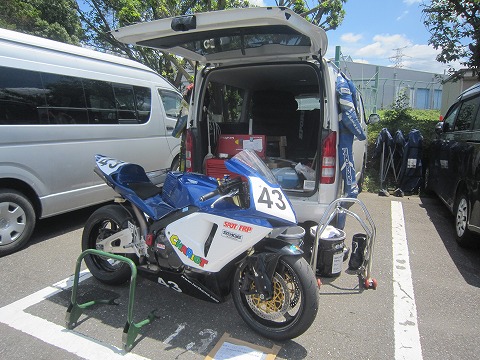 7:09 準備 駐車場にハイエースを止めたら、バイクと荷物を下ろして準備を始めます。 伊藤さんには、毎度のタイヤのワックス落としと、ステッカー剥がしをお願い。 伊藤さんも今回でヘルパー3回目、準備の要領も憶えてもらって、お願いする方の安心してまかせておけます。 『伊藤さん、今回もよろしくお願いします。 (^_^)/』 ガソリンは昨日のうちに入れておいたし、ポンダーも取り付けておいたので、レース当日の朝としては、久しぶりに余裕がありますね。 (本当はこうじゃなきゃダメなんだけどね) |