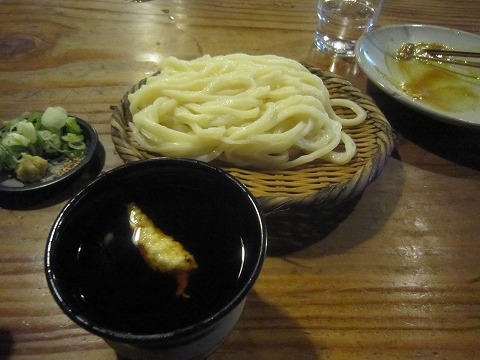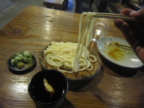 うどんは標準的な太さで、手繰ってみると結構長くて、汁の入ったお猪口こに入れるのに高々と持ち上げなければなりません。