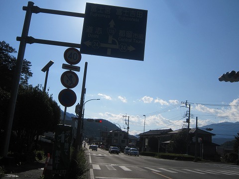 14:29 県道24号線へ 都留バイパスに入り南西に進むこと6km弱、山梨県道24号都留道志線へ接続する交差点までやってきました。 さっきから、道路看板のところにくると逆光ですね。 見難いったらありゃしない! (`Д´) ここを右折して県道24号線で道志方面に向かいます。 |