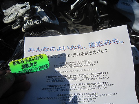 14:55 マナーアップ 道の駅にバイクを駐車すると、ボランティアらしき人がパンフレットを配布中。 道志みちのマナーアップキャンペーンをしていました。 道志みちは途中で他から流入・流出する路線が無いので、比較的信号もすくなく、軽くワインディングしているのでライディングやドライビングを楽しめる路線ではあるんですが・・・・。 道志みちも以前に比べると交通量も増えた様で。 やっぱりクルマとバイクは、スキーとスノーボードと同じ様に、動き方が異なるので共存するのはなかなか難しいものがあるようですね。 自分なんかも以前はちょくちょく走りましたが、最近はクルマが多かったり、取り締まりの白バイが多かったりして、遠ざかっていますね。 |