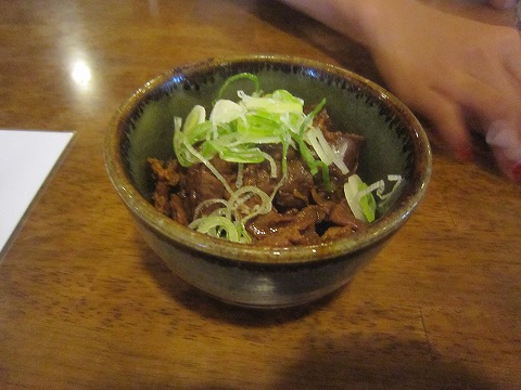 15:18 もつ煮 まず運ばれてきたのが、すぐに出てきて箸休めになるとおもい注文した ”もつ煮”。(\432) 早速、『いただきます!』 これはお品書きには書いてありませんでしたが、ウマのモツですね。 ブタとかウシの様な脂っこさはありません。 甘辛く、どちらかと言うとお酒のつまみにピッタリの味付けですね。 自分の好みはどちらかと言うと、筑波サーキットのレストランで供されている脂っこいのが好みです。 (^_^;) |