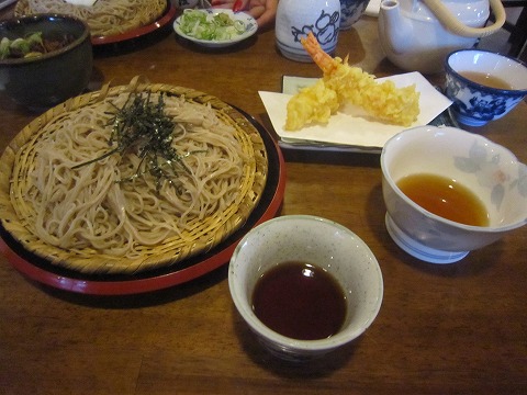15:21 海老天ざる 続いて、自分が頼んだ”海老天ざる”(\1004)が運ばれてきました。 天ぷらの汁と、蕎麦の汁が別々なのが良いですね。 天つゆが無くて、蕎麦つゆだけだと、天ぷらを漬けたとき蕎麦つゆに天ぷらの油が溶け出してしまいます。 それはそれで美味しいんですが、個人的には前半は油っ気なしの蕎麦つゆで食べたいんです。 なので、最初の内は蕎麦は蕎麦つゆで、天ぷらは天つゆで食べておいて、途中から天ぷらを蕎麦つゆにつけて油を溶かし、それで蕎麦を食べるのが、2つの味が楽しめて好きです。 3時を過ぎての昼食なので流石にお腹は空いていて大盛を食べたいところですが、夕食の時間も近いので普通盛りでガマンしました。(笑) |