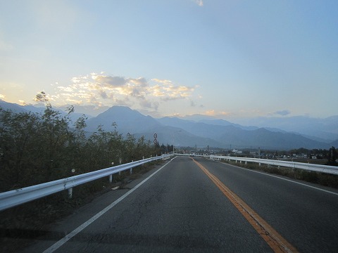 16:40 国道147号線で 安曇野の市街地でスニーカーを購入したあと、国道147号線を北上し、今夜の宿のある大町市を目指します。 目の前には北アルプスの山が少し傾いてきた陽に照らされています。 |