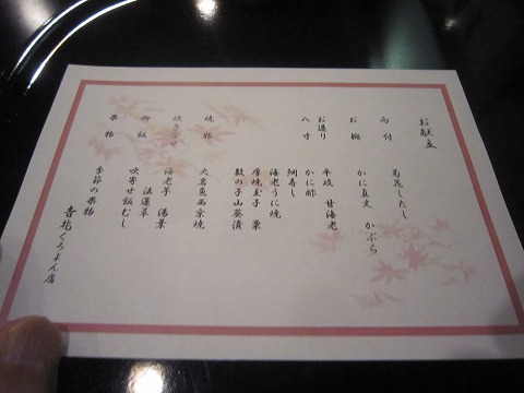 19:14 献立 入口からテーブルに案内されると、テーブルの上には今日の献立。 既に客人を出迎える準備ができていることを表しているようです。 今晩は会席料理です。 |