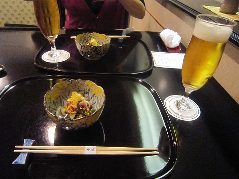 19:17 菊花したし 席について飲物を選び、しばらくして1品目に供されたのは、向付(むこうづけ)”菊の花のおひたし”。 飲物は生ビールでスタートね。 おひたしは、出汁の味が上手く付けられていて、美味しいです。 普段であれば、出されてもそのまま何となく食べて終わってしまいますが、一口口に入れると、「美味しいなぁ〜。」と思うほど、しっかりと出汁の味が生きています。 そして、黄色いのは菊の花とすぐにわかりますが、紫色の食材も入っています。 給仕さんに『これは?』と尋ねると、 『これも菊の花です。』と即答。 良く教育されていると思いましたね。 ところで、”おひたし”が正解? ”おしたし”が正解? 自分はずっと、”おひたし”と思っていましたが、献立を見ると”したし”になっています。 |
